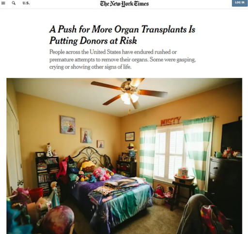 2025年7月、『ニューヨーク・タイムズ』は、米国における心停止後臓器提供(DCD)の実態を検証する調査報道を掲載した。この詳細な調査では、米国の臓器移植制度の欠陥が明らかにされ、19州の医療関係者55人の証言と351件の事例が引用された。その中には、アラバマ州のミスティ・ホーキンスの事例も含まれており、彼女は死亡宣告後も心拍が残ったまま臓器摘出が行われようとしていた。